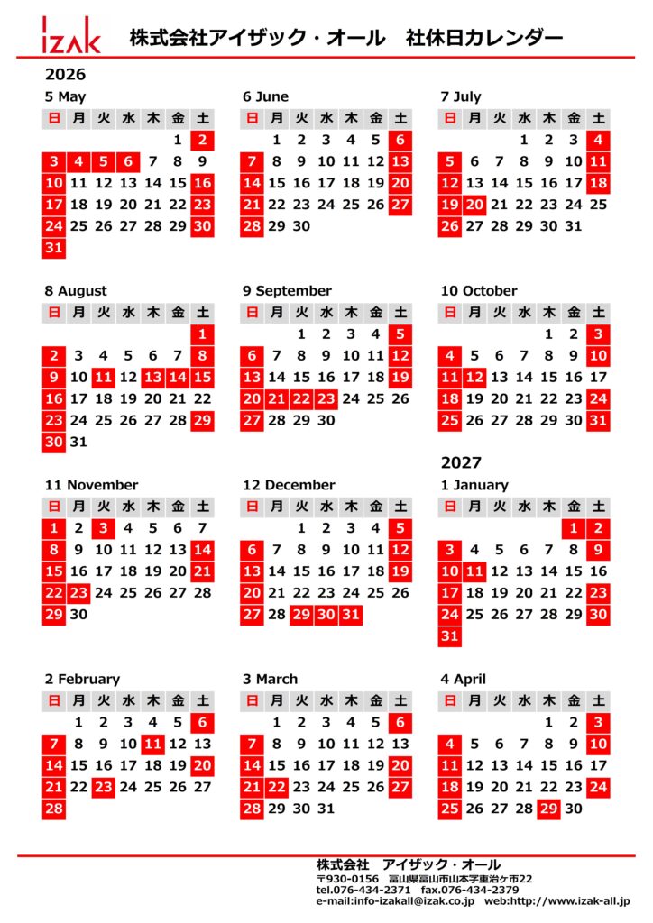 2026年度 社休日カレンダー
